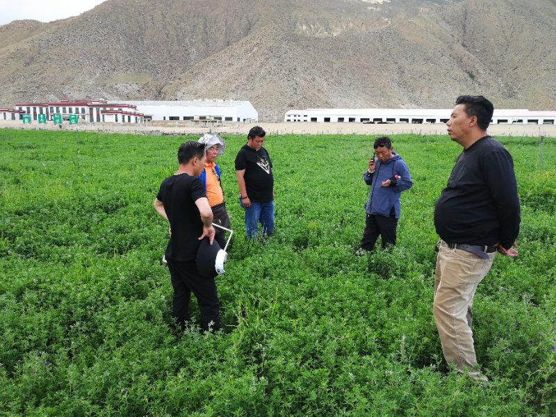 隨后,次仁云丹老師在紫花苜蓿種植現(xiàn)場,就第一期收割后復蘇管理、濕草翻曬、儲藏等問題,與西藏江平公司技術人員進行溝通交流,并提出了許多寶貴意見。