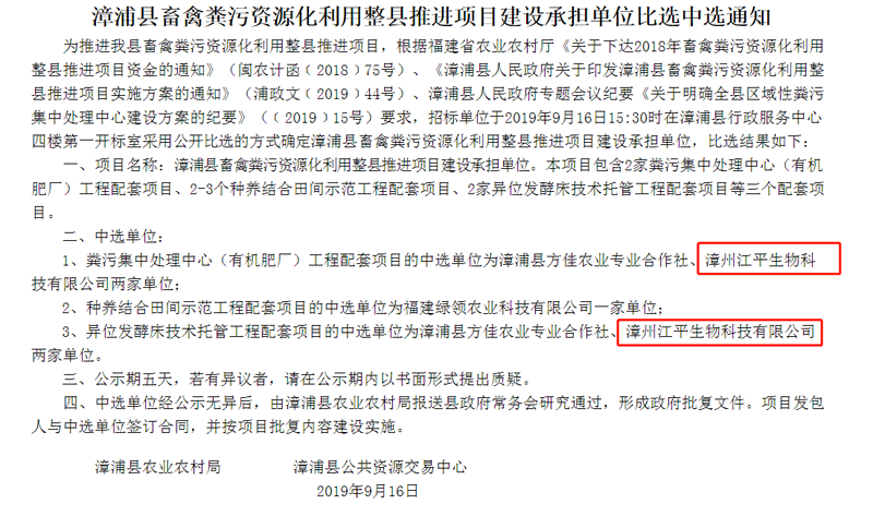 2019年9月16日下午,在漳浦縣行政服務(wù)中心4樓第一開標室,漳浦縣農(nóng)業(yè)農(nóng)村局組織進行漳浦縣畜禽糞污資源化利用整縣推進項目建設(shè)承擔單位比選會,我司順利通過比選被確定為漳浦縣佛曇鎮(zhèn)畜禽糞污集中處理中心(有機肥廠)項目和漳浦縣異位發(fā)酵床技術(shù)托管工程項目建設(shè)承擔單位。