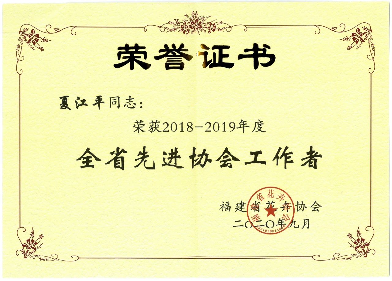 同期,我司董事長夏江平獲得2018-2019年度“全省先進協(xié)會工作者”殊榮,這也是夏江平董事長自2010年以來連續(xù)五次獲得“全省先進協(xié)會工作者”榮譽。感謝福建省花卉協(xié)會對我司及夏江平董事長對于促進花卉產(chǎn)業(yè)發(fā)展所做的努力給予充分的肯定與支持!