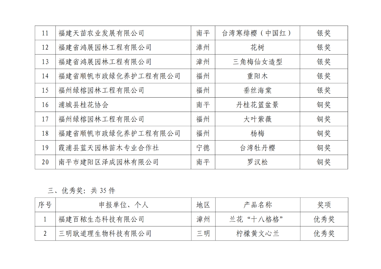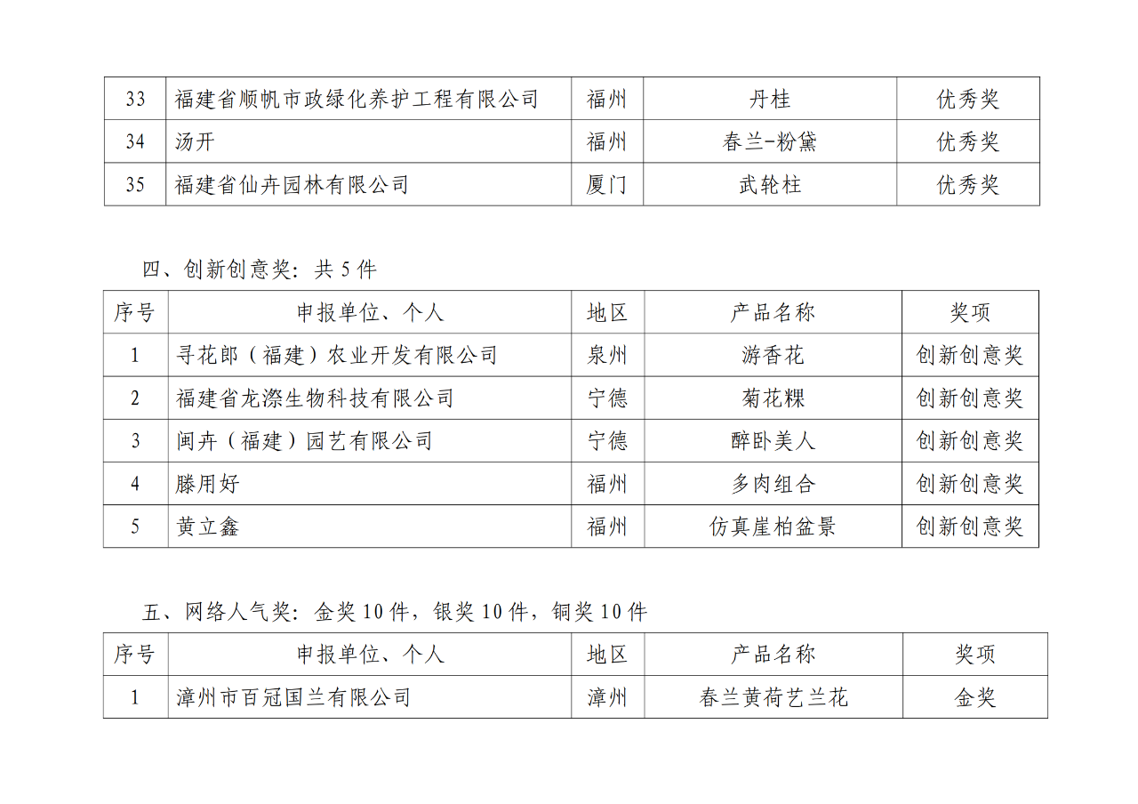 經(jīng)過線上線下綜合評審,活動評選出花卉類金獎產(chǎn)品 11 件,銀獎產(chǎn)品 13 件,銅獎產(chǎn)品 17 件;苗木類金獎產(chǎn)品 4 件,銀獎產(chǎn)品 11 件,銅獎產(chǎn)品 5件;創(chuàng)新創(chuàng)意獎產(chǎn)品 5 件;優(yōu)秀獎產(chǎn)品 35 件;網(wǎng)絡(luò)人氣產(chǎn)品金獎 10件、銀獎 10 件、銅獎 10 件。