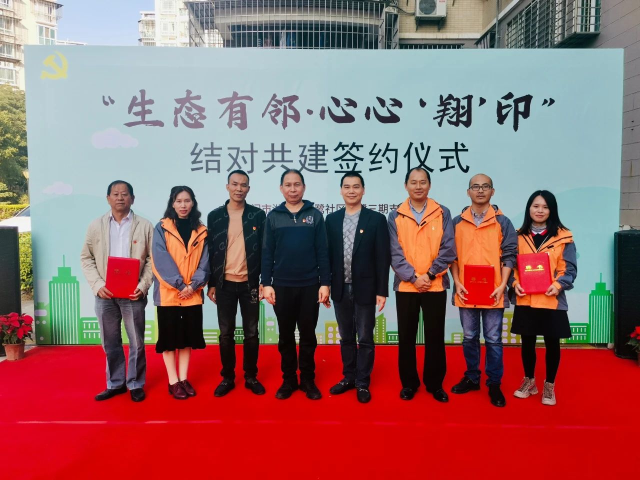 活動(dòng)現(xiàn)場(chǎng),在殿前街道辦事處主任助理王聲電、翔鷺社區(qū)黨總支書記洪永超等領(lǐng)導(dǎo)的見(jiàn)證下,江平生物黨支部同翔鷺三期黨支部莊重的簽下了社企結(jié)對(duì)共建協(xié)議書。