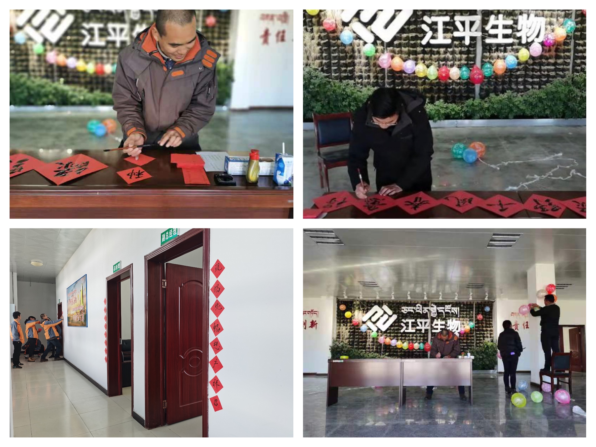 臨近中午,李基裘副總經(jīng)理等人揮筆灑墨,寫(xiě)出一幅幅鏗鏘有力的新春對(duì)聯(lián),一筆一劃都飽含著江平生物的美好愿景。貼上紅紅火火的對(duì)聯(lián),配上繽紛色彩的氣球,整個(gè)公司頓時(shí)充滿節(jié)日的喜慶。