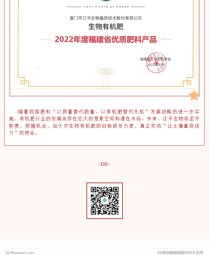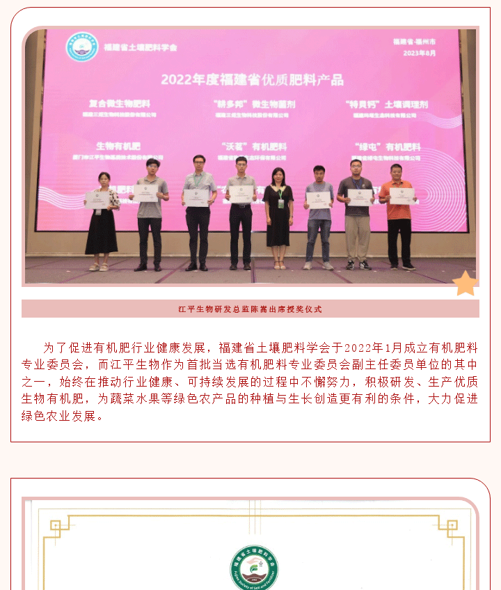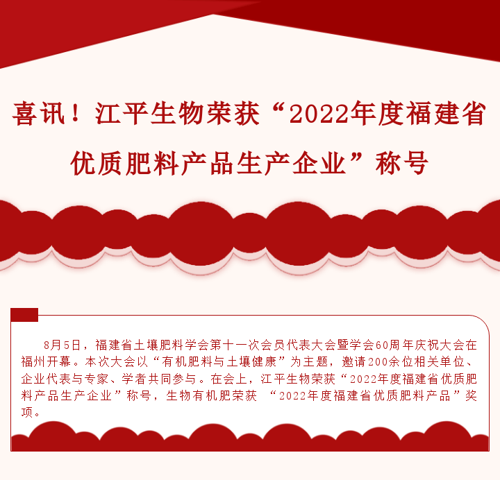 喜訊!江平生物榮獲“2022年度福建省優(yōu)質(zhì)肥料產(chǎn)品生產(chǎn)企業(yè)”稱號(hào)