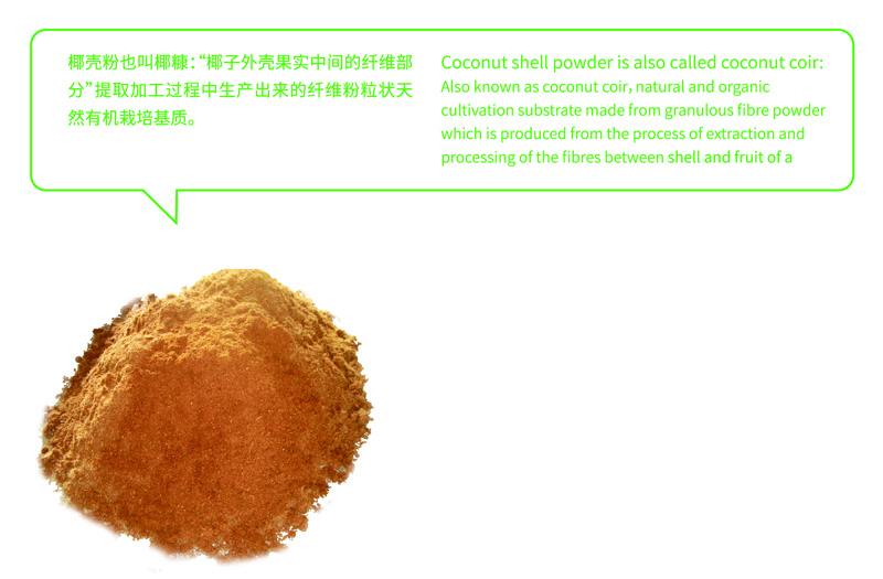 l Coconut powder is normally used as a raw material by being mixed with peat and other materials or used alone. If it is used as a medium alone, water and fertilizer management shall be strengthened because it has low nutrient content.
