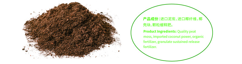 ● This product is mainly made from quality peat and imported coconut powder which are mixed in scientific proportion. It provides a healthy rhizosphere environment for the growth of root systems of plants thanks to its ideal gas permeability and great performance of moisture and fertility preservation.
